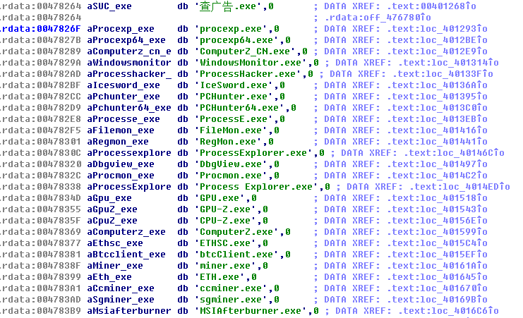 procexp.exe、procexp64.exe、ComputerZ_CN.exe、WindowsMonitor.exe、ProcessHacker.exe、IceSword.exe、PCHunter.exe、PCHunter64.exe、ProcessE.exe、FileMon.exe、RegMon.exe、ProcessExplorer.exe、DbgView.exe、Procmon.exe、Process、Explorer.exe、GPU.exe、GPU-Z.exe、CPU-Z.exe、ComputerZ.exe、ETHSC.exe、btcClient.exe、miner.exe、ETH.exe、ccminer.exe、sgminer.exe、MSIAfterburner.exe
